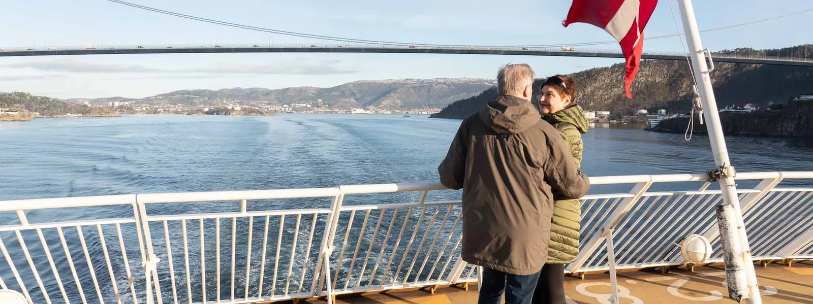Hvis vejret indbyder til det, bør I gå op på dæk for at opleve den fantastiske indsejling til Bergen, hvor færgen sejler tæt under Askøybroen på vej mod byen, der ligger smukt omkranset af fjelde i en indlandsfjord. Her ligger færgen til kaj i en time, hvorefter turen går retur mod Stavanger gennem det idylliske vestnorske landskab.