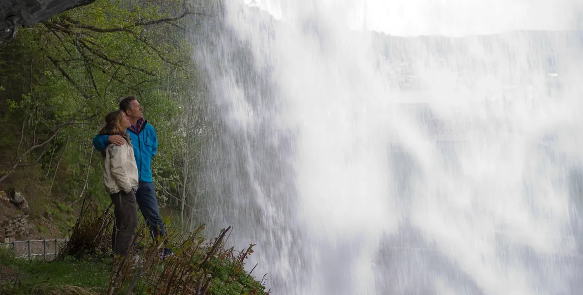 Der er anlagt en god, asfalteret sti (der også kan bruges af kørestolsbrugere eller dårligt gående) fra parkeringspladsen, og efter blot ca. 600 meters gang står I direkte bag det smukke gardin af brusende vand.