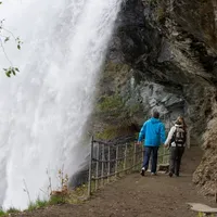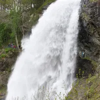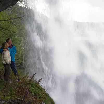 At se det smukke vandfald - med et fald på ca. 50 meter - i den idylliske dal er en fantastisk oplevelse i sig selv, men det helt særlige ved Steindalsfossen er, at man kan gå ind bagved det brusende vandfald, helt uden at blive våd.