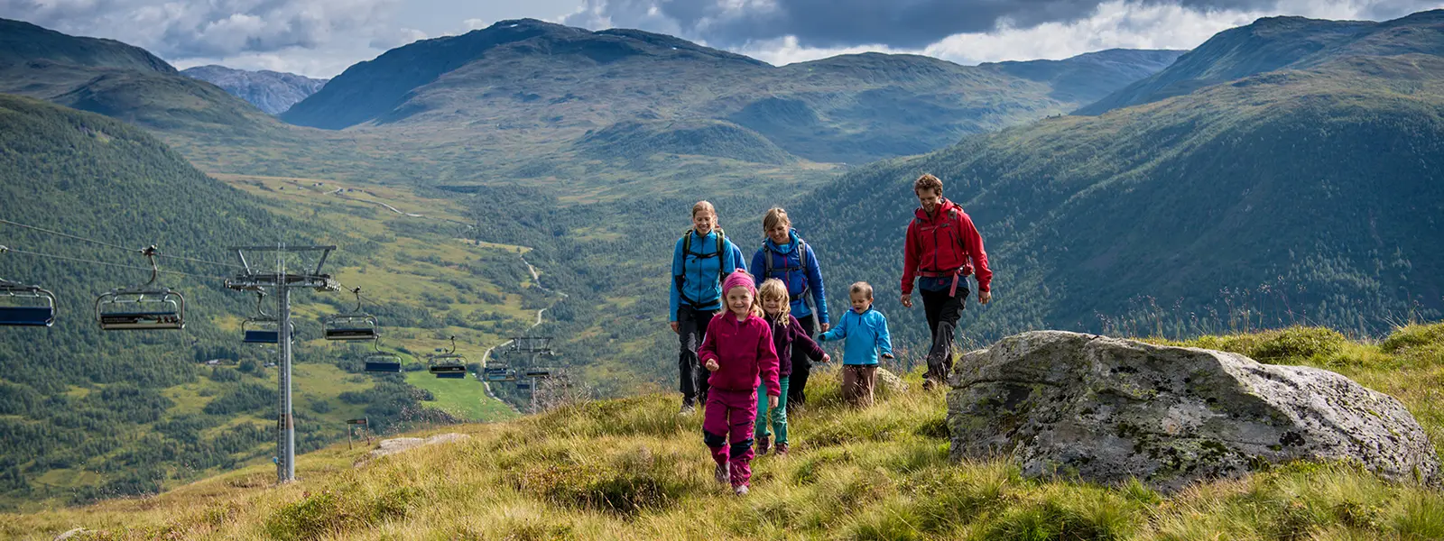 - Tag Myrkdalsekspressen til tops og gå retur til Myrkdalen Hotel. I kan vælge forskellige ruter ned ad fjeldet, fx ruten forbi caféen Fjellstova Vetlebotn, ruten med Naturquiz eller ruten ned langs Myrkdalsekspressen. Disse ruter er mellem 1,4 og 3,4 km lange og velegnede for hele familien.