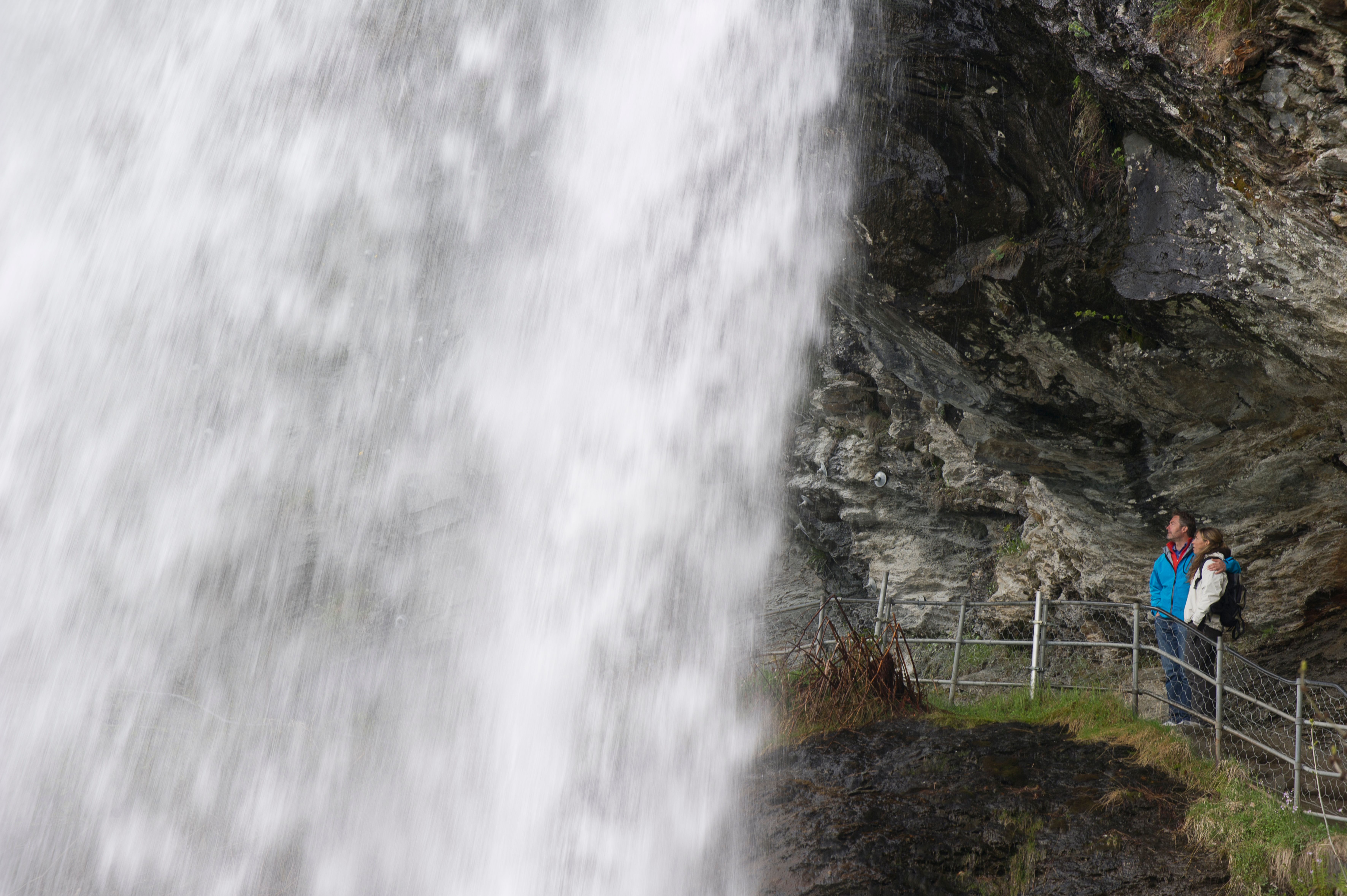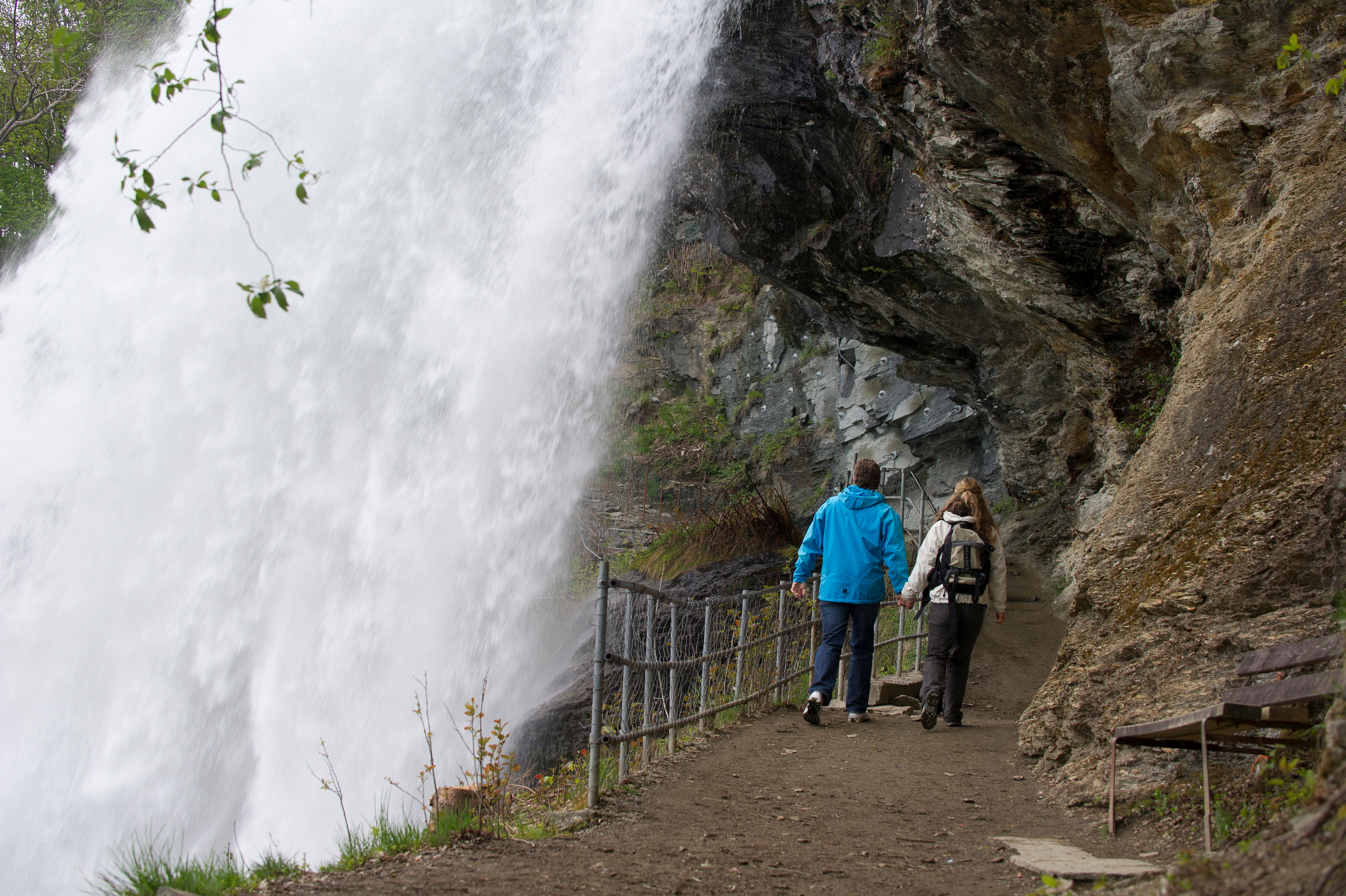Der er anlagt en god, asfalteret sti (der også kan bruges af kørestolsbrugere eller dårligt gående) fra parkeringspladsen, og efter blot ca. 600 meters gang står I direkte bag det smukke gardin af brusende vand.