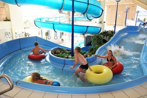 Badelandet er et eldorado for børn i alle aldre - Nyd fx turen i den 70 meter lange vandrutsjebane, sus gennem "elven Otras" forhindringer på gummiringe eller svøm under vandfaldets plasken.