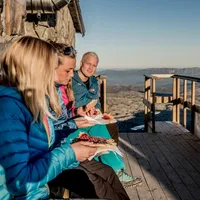 Vælger I at tage turen på gåben, går den brede og velafmærkede sti over store og små sten, og med en højdeforskel på 700 m siger det sig selv, at udsigten bliver bedre og bedre for hvert eneste skridt. Når I når toppen, kan I belønne jer selv med kaffe og vafler fra den hundrede år gamle turisthytte, mens I nyder panoramaudsigten: Fra Gaustatoppen kan I nemlig se en sjettedel af Norge i klart vejr!