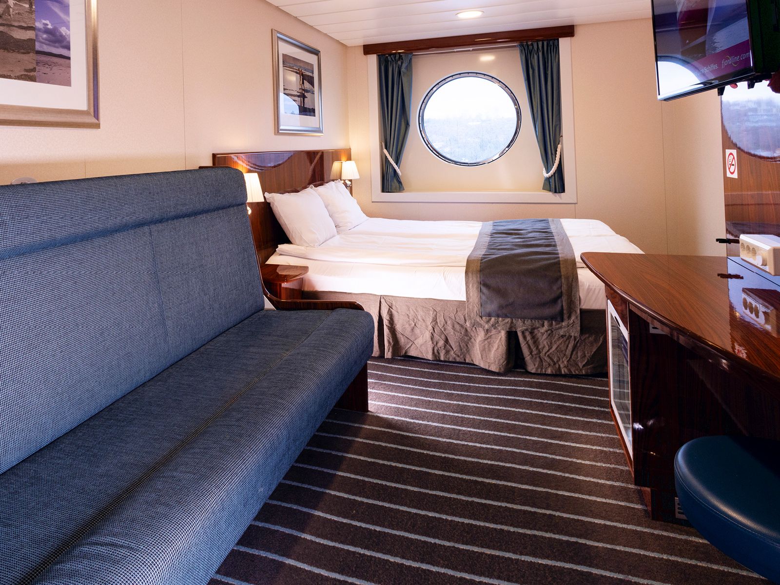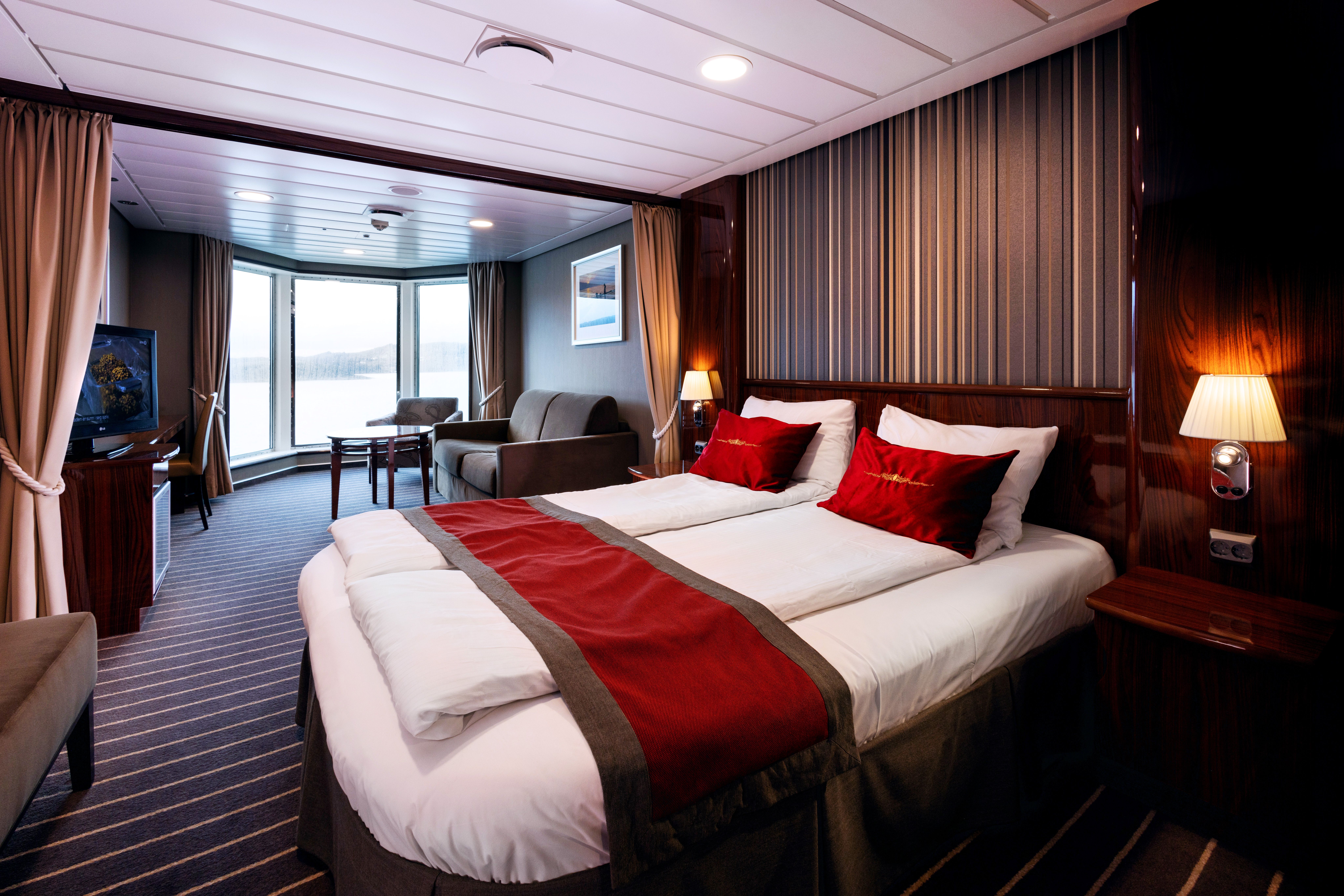 Indbydende kahyt for op til fire personer. Den har panoramiske udsigter udover boven og styrbordssiden. Kahytterne har dobbeltsenge og en (dobbelt) sovesofa, velegnet til 1 barneseng, et TV, minibar, køleskab, og et badeværelse med bruser og toilet. Kahytten er omkring 21 m² og ligger over broen, forrest dæk 10.