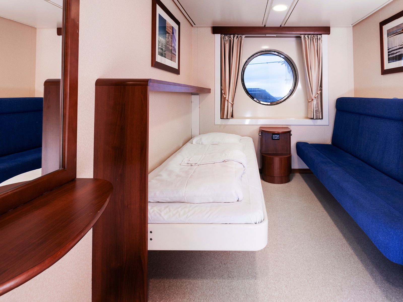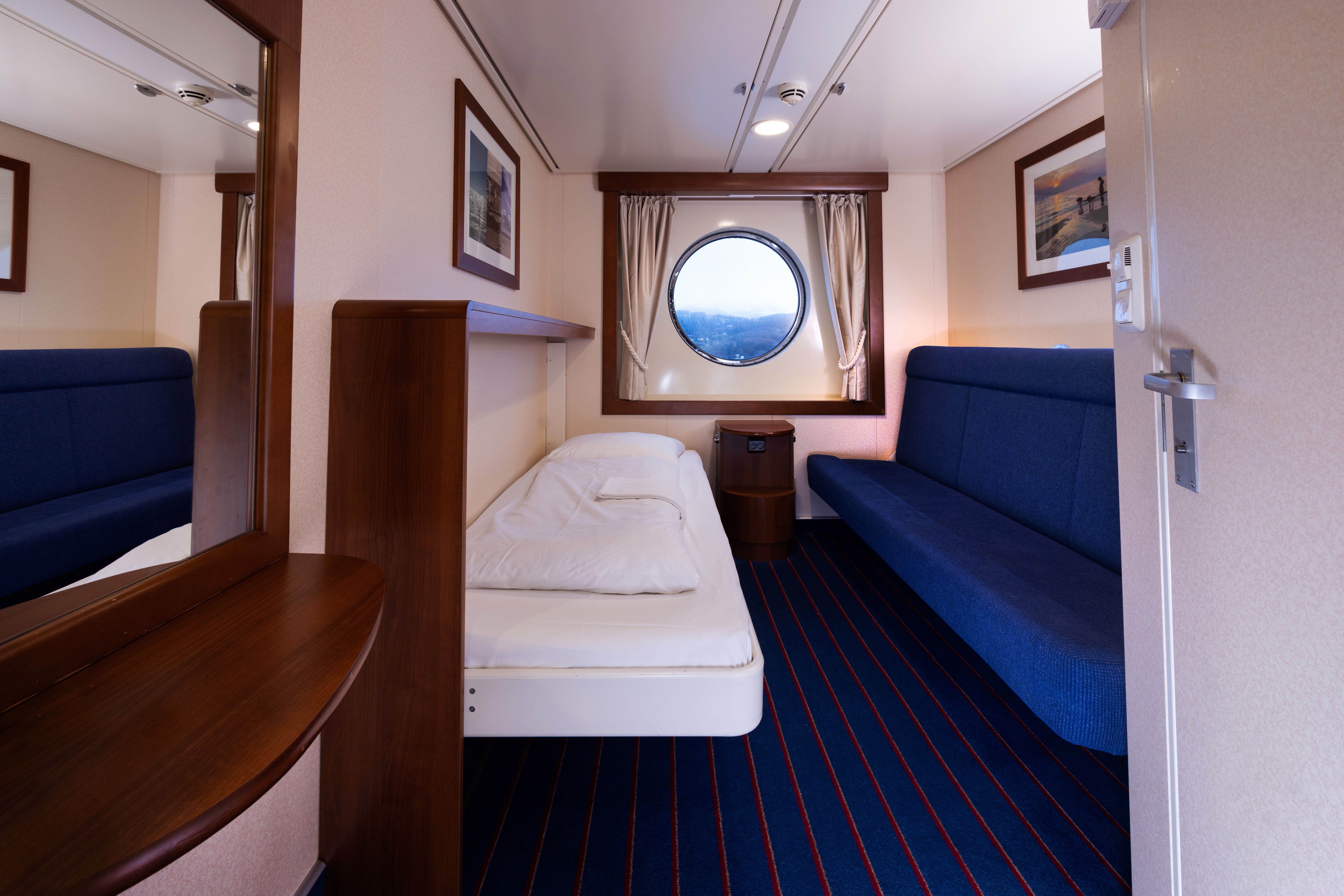 Komfortabel kahyt på 8,5 m² for 1 person. Disse kahytter er udstyret med en seng, sovesofa, badeværelse med bruser og toilet. De er placeret på dæk 8. Noget støj fra natklubben skal forventes.