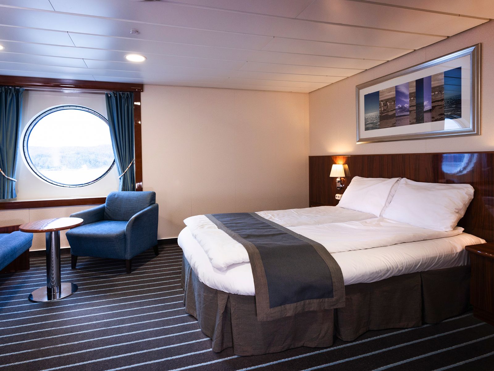 Smukke kahytter for op til fire personer. Med en beliggenhed over broen forrest i skibet tilbyder disse kahytter panoramiske udsigter med vinduer fra gulv til loft. Kahytterne har dobbeltsenge og en (dobbelt) sovesofa, et TV, minibar, køleskab og et badeværelse med bruser og toilet. Disse kahytter er mellem 15 og 18,5 m² store, og de ligger forrest på dæk 10.