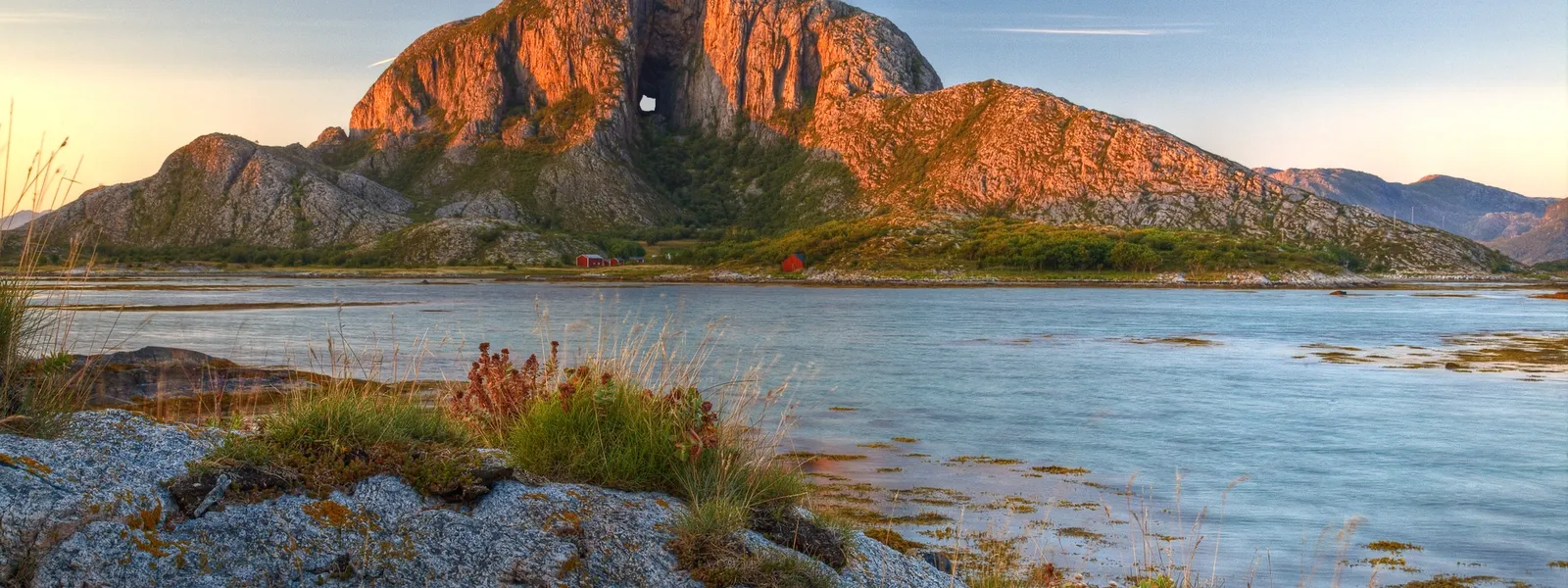 Norwegen hat eine lange Tradition von spannenden Sagen und Legenden, welche der abenteuerlichen Landschaft des Landes geschuldet sind - Torghatten ist da keine Ausnahme. Einer lokalen Sage nach ist das spektakuläre Loch das Ergebnis einer dramatischen Liebesgeschichte: Der Troll Hestmannen bemühte sich um ein schönes Mädchen namens Lekamøya. Als er einsah, dass er Sie nicht bekommen konnte, schoss er einen Pfeil auf sie. Der Trollkönig in Sønnafjellet sah dies und warf seinen Hut vor den Pfeil, sodass er direkt hindurchschoss und so das Loch entstand. Genau in diesem Augenblick ging die Sonne auf und verwandelte alle in Stein - und so entstand der außergewöhnliche Berg!