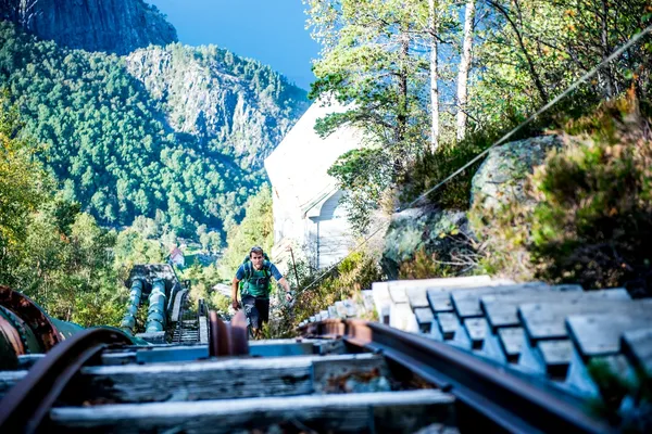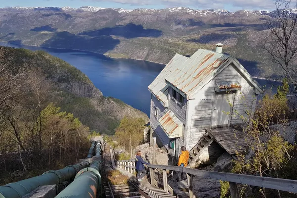 Die Wanderroute beginnt in der kleinen Stadt Flørli, die nur mit der Fähre zu erreichen ist. Die lange Holztreppe entstand vor mehr als 100 Jahren, als das Wasserkraftwerk in Flørli gebaut wurde. Das Wasser lief durch die riesigen Rohre neben der Treppe den Berghang hinunter.Der Aufstieg ist anspruchsvoll (und nichts für Leute mit Höhenangst), planen Sie also unterwegs genügend Zeit für Pausen und Fotostopps ein.