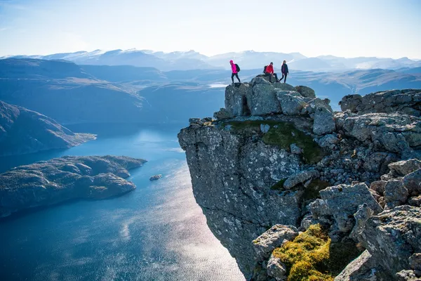 Der Blick von oben ist die Anstrengung aber wert! Von hier blickt man über die kleinen Inseln des Archipels und die spektakulären Fjorde und Berggipfel im Landesinneren. Wenn Sie mutig genug sind, gehen Sie bis an die Felskante und schauen direkt auf die winzig kleinen Boote, die fast einen Kilometer unter Ihnen auf dem Fjord segeln.