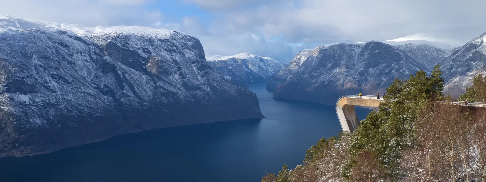 In einer Höhe von 650 Metern über dem Aurlandsfjord erwartet Sie der spektakulärste Aussichtspunkt der Region, der Stegastein. Am einfachsten können Sie ihn im Rahmen einer geführten Besichtigungstour erkunden: Ein Bus bringt Sie von Flåm aus sicher über die serpentinenreiche Straße zu der einzigartigen Aussichtsplattform, die 30 Meter weit aus der Bergwand hinausragt. Dort erwartet Sie ein einzigartiger Panoramablick auf die schneebedeckten Berge und den wunderschönen Fjord, der weit unter Ihnen liegt.