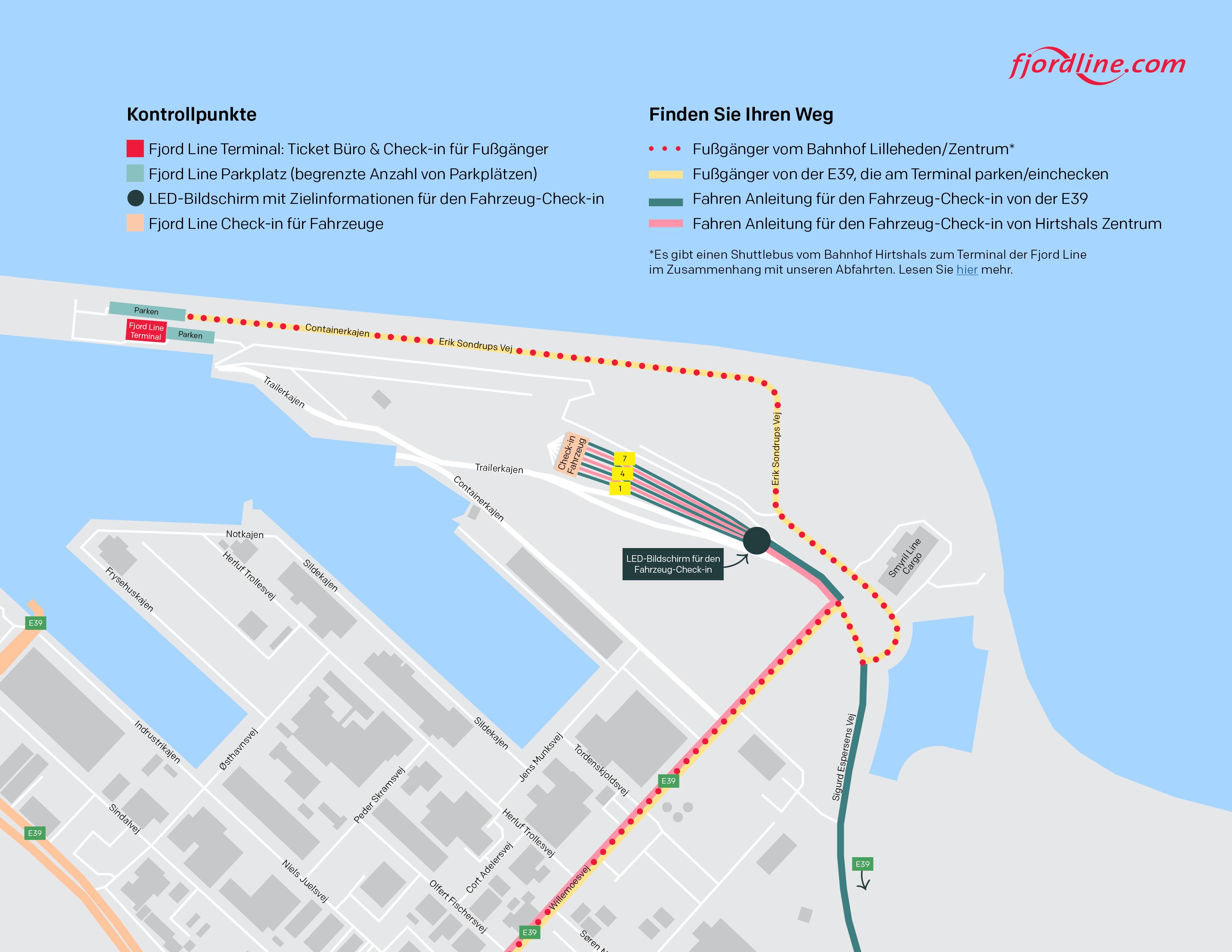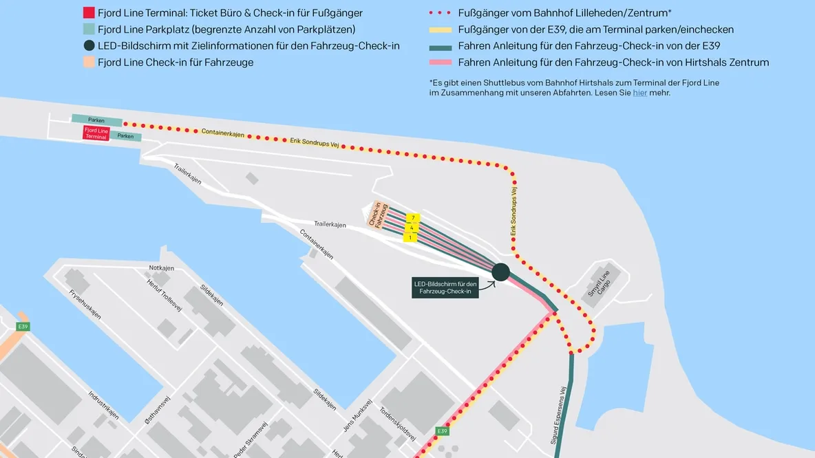 Um Ihre Reiseerfahrung zu erleichtern, haben wir eine Karte des Hafens von Hirtshals erstellt. Egal, ob Sie zu Fuß oder mit dem Auto unterwegs sind, diese Karte hilft Ihnen, den Weg zum Check-in-Bereich zu finden.