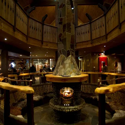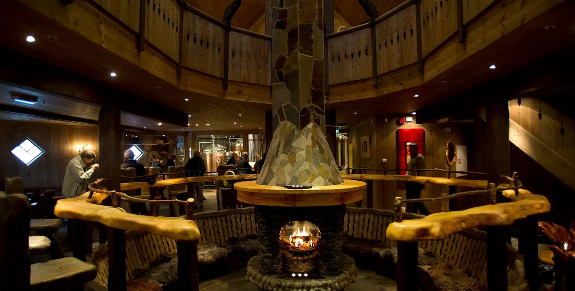 The microbrewery Ægir Brewery is located in an extremely cosy Viking–style building From the outside, the building looks like a stave church, and from the inside it exudes inspiration from Norse mythology. The centrepiece of the pub is a unique nine metre high fireplace surrounded by dragon heads, wooden walls and benches covered in warm sheepskin.