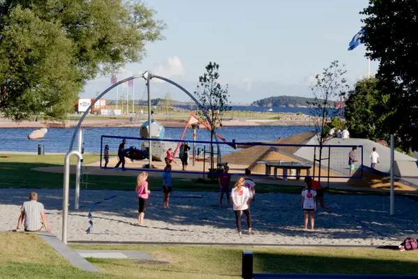 This well-maintained city beach offers bathing piers, seating areas – and even palm trees. It is also home to the well-known “Palmesus” festival, Scandinavia’s largest beach festival.
