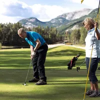 The spectacular location also provides extra challenges on the round trip, (regardless of your handicap) when hitting shots over small bays or out to the lake shore. Maybe you should do a competition between you to see who can hit the most (or least) times in the water?