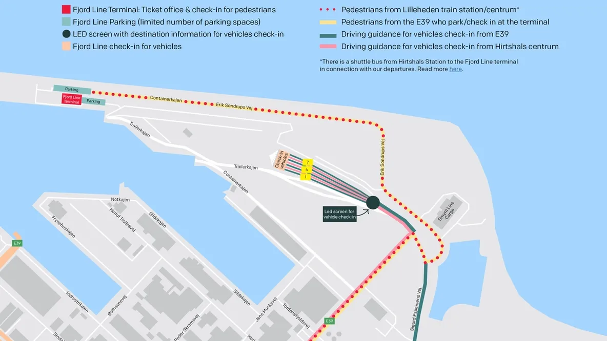 To make your travel experience easier, we have created a map of Hirtshals port. Whether you are on foot or driving, this map will help you find the way to the check-in location.
