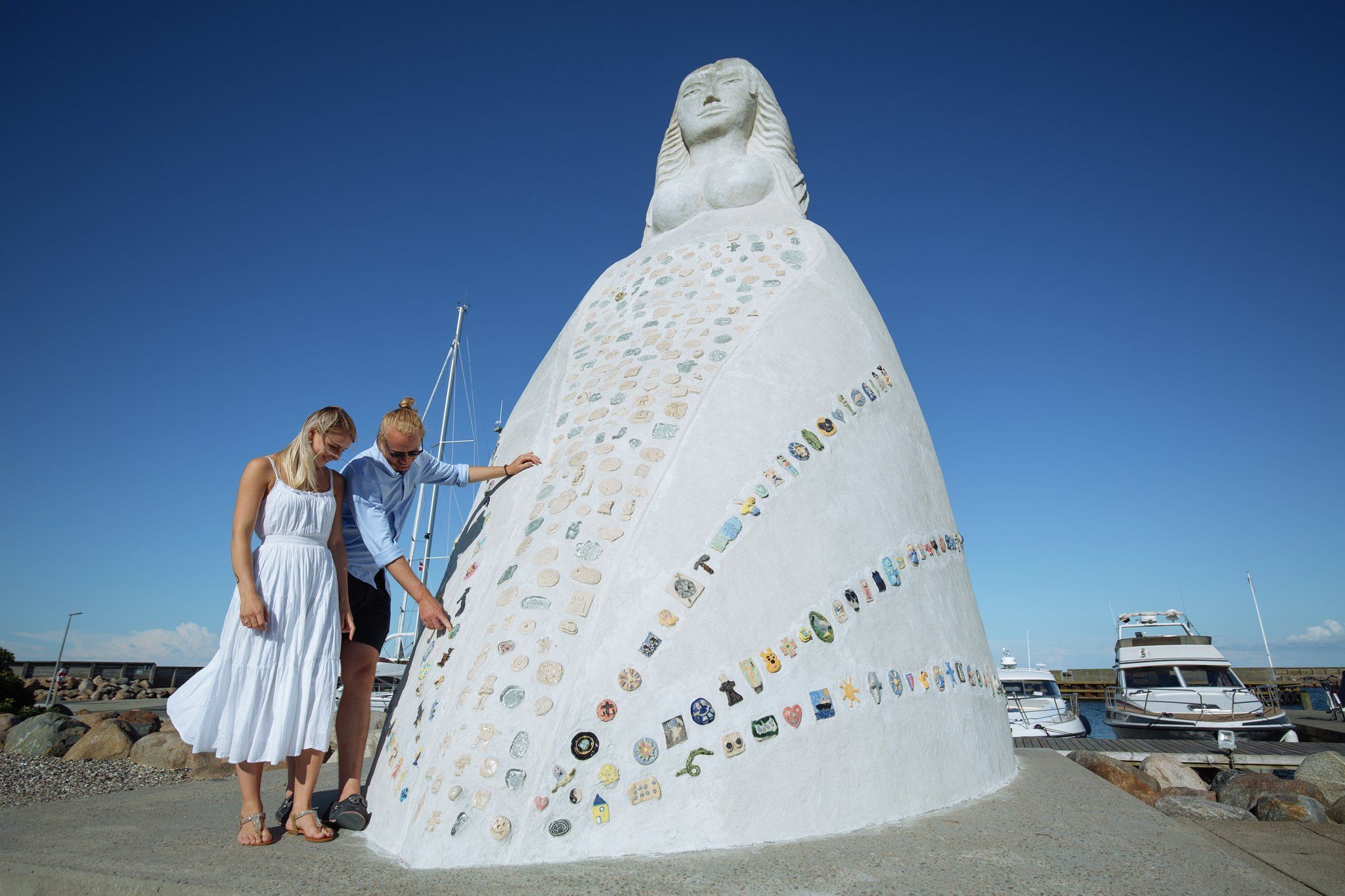 En fantastisk nesten syv meter høy skulptur, markerer innseilingen til vakre Sæby. Skulpturen henviser til Henrik Ibsens berømte skuespill «Fruen fra havet».
