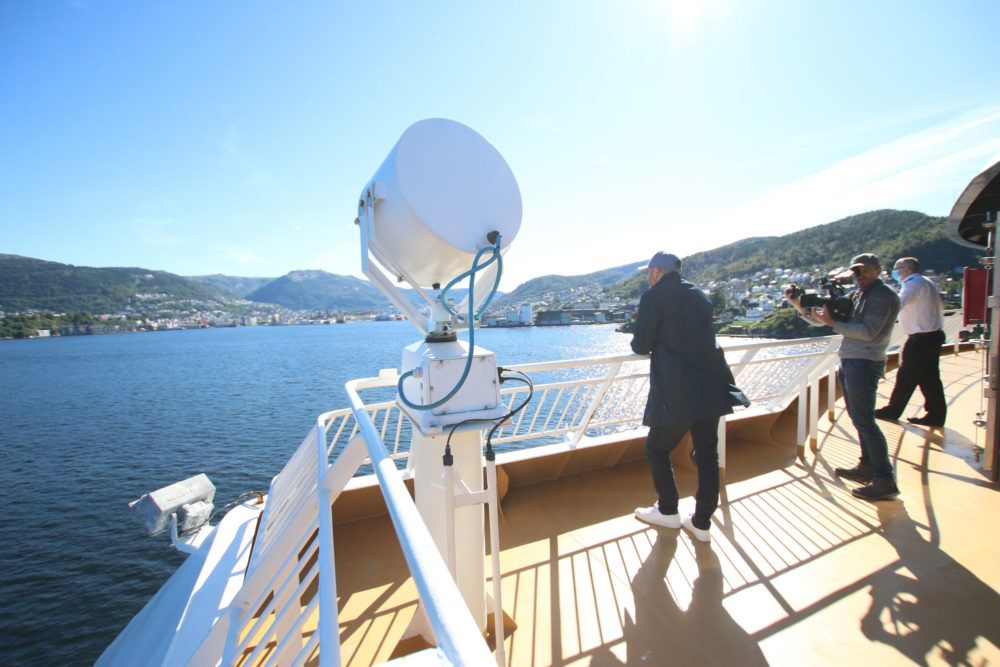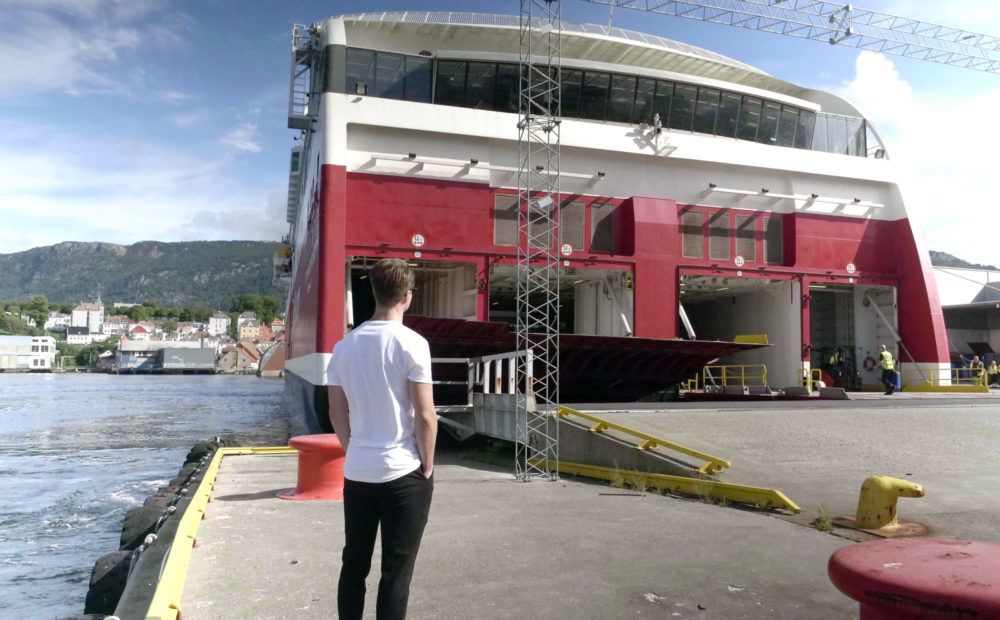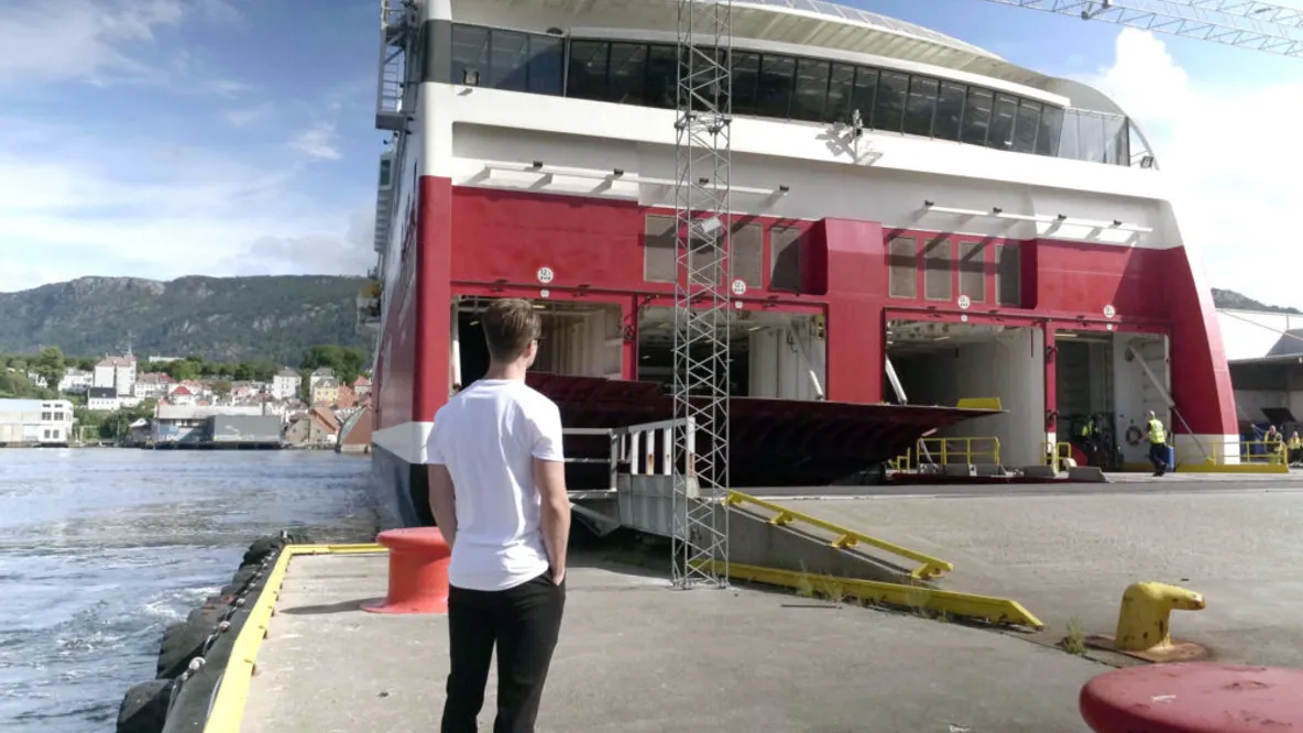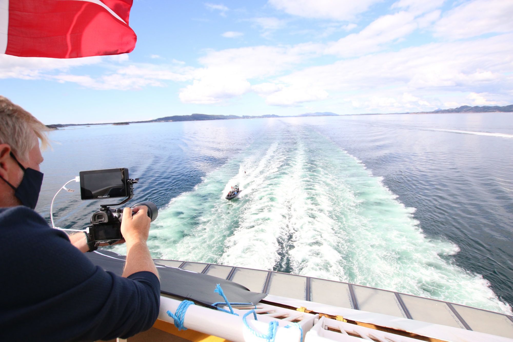 Fremme i Bergen ble vi møtt av en pen bukett med filmfolk og oppofrende Fjord Line-ansatte som gjorde det de kunne for å bidra, både til logistikken og til å sørge for at utenforstående ikke skulle få vite hva som foregikk og forsøke å holde skjult at selveste Harald Rønneberg og Kygo tilbragte en varm sensommerdag på Nøstekaien i Bergen. Og selvsagt av sistnevnte: Kygo! Nå skulle nemlig utsiden av skipet inspiseres og de to som dagen etter skulle få vannski på bena og henge etter kolossen etter Vatlestraumen, gjorde temmelig store øyne da de kom tett innpå de 16.000 tonnene med stål.