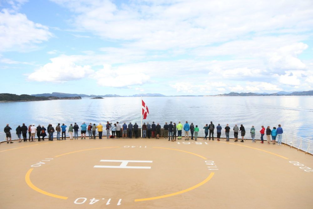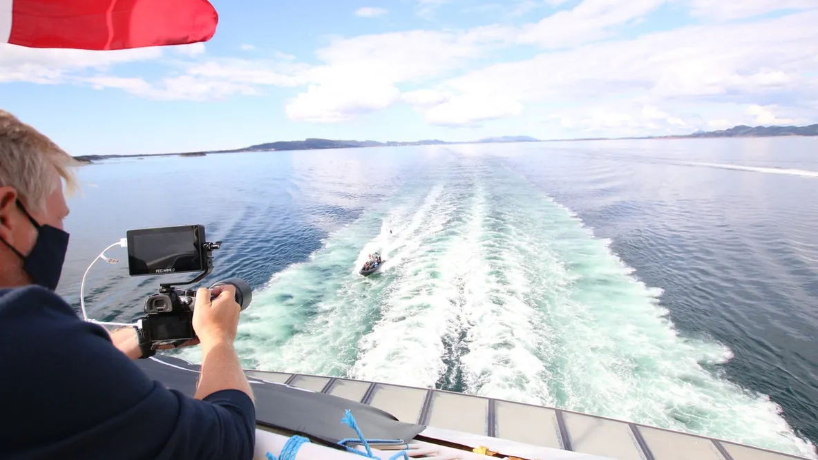 Dagen etter kastet vi loss med MS Bergensfjord i et praktfullt sensommervær, fulgt av to hurtiggående båter som etter hvert kom faretruende nær skipet. Det var med andre ord ikke til å unngå at enkelte passasjerer om bord etter hvert begynte å forstå at noe var i gjære. Kaptein Richter kjørte skipet opp i en marsjfart på godt over 20 knop og ribbene fulgte pent etter. Så var det å kaste ut liner og forsøke å få førstemann ut, Harald, i perfekt posisjon.