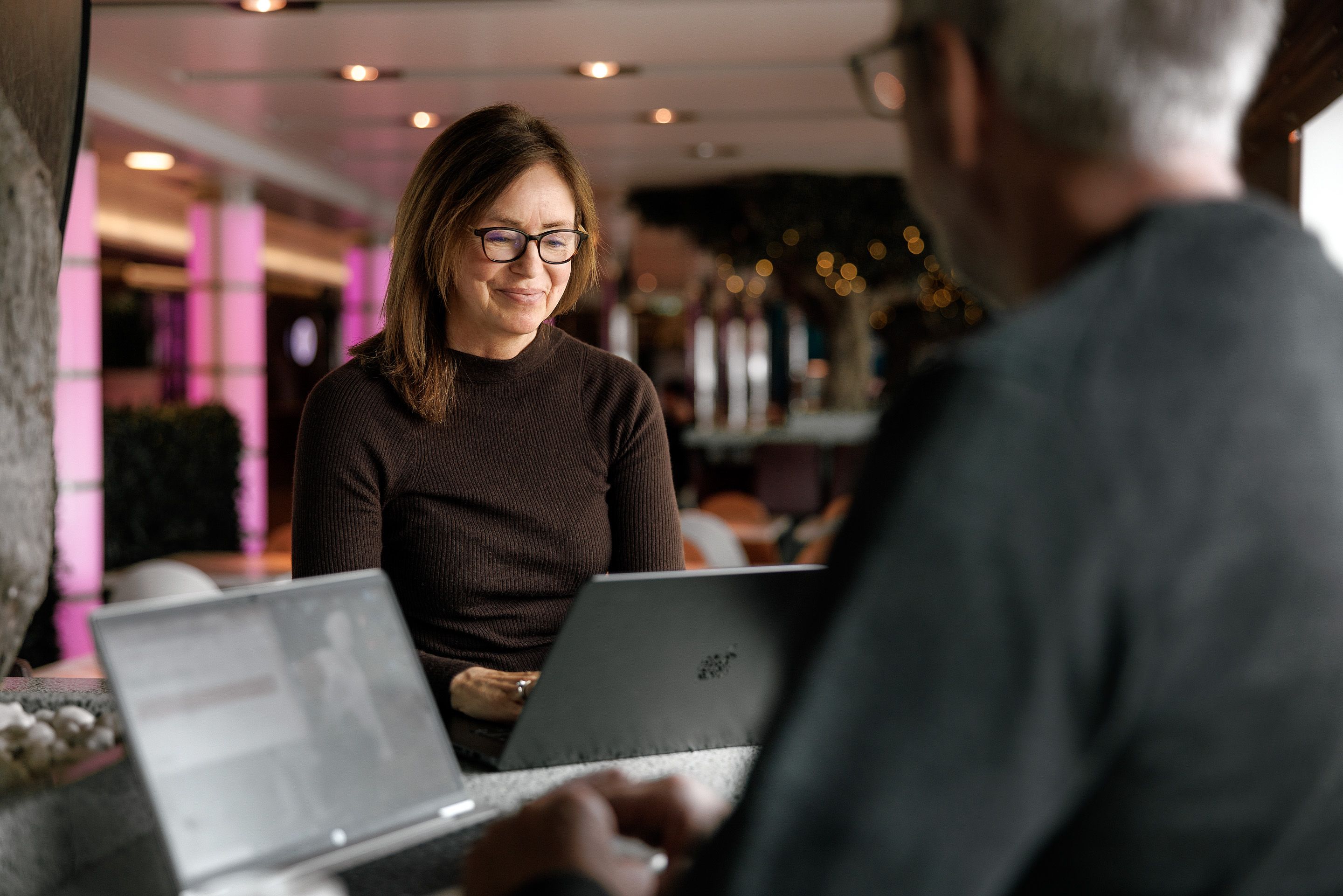 På våre skip finner du behagelige lounger der det er enkelt å få jobbet mens du reiser. Her sitter du komfortabelt, har tilgang til strømuttak og wifi og kan også bestille mat og drikke.