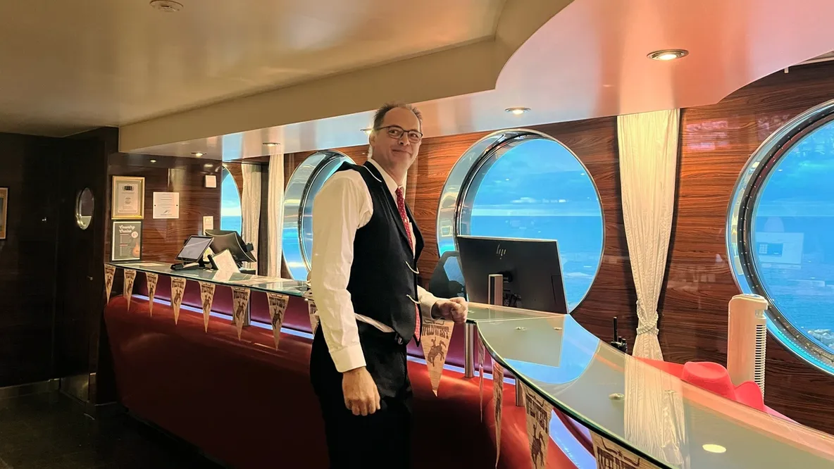Norske Mona (60) har vært et kjent og kjært fjes i resepsjonen på MS Stavangerfjord i ti år, der hun tar mot nye passasjerer med åpne armer og en smittende latter. Både passasjerer og kolleger vet å sette pris på hennes gode humør og omsorgsfulle holdning.