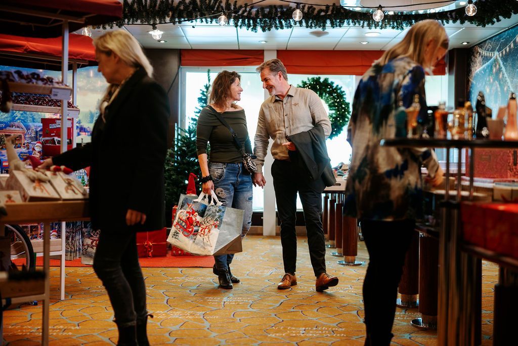 Ta turen innom vår Fashion-butikk og det stemningsfulle julemarkedet om bord. Her finner dere flotte julegaver – uten stress og trengsel. Gled dere over gode juletilbud og unike produkter som marmelade, kirsebærsaus, julepynt i glass, julekalendere, epleskiver, gløgg – og den populære solbærshoten "Nissetiss". På utvalgte avganger byr vi også på deilige smaksprøver!