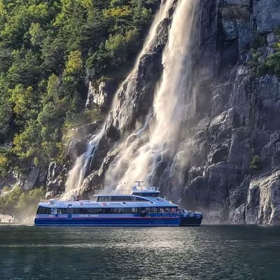 Her kan I læne jer tilbage på dækket eller i bådens hyggelige salon og nyde panoramaudsigten til en sand perlerække af naturoplevelser: Fra den sagnomspundne Fantahålå-grotte, forbi Hengjanefossen, hvor I kommer så tæt på, at I kan smage på vandfaldets friske fjeldvand, og til turens absolutte højdepunkt: majestætiske Preikestolen, som med sine 604 meter troner højt over Lysefjordens krystalklare vand.