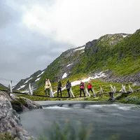 The tour is around ten km long round trip and can be done by the whole family. You'll pass through gently undulating terrain with a steady gradient, so you can set your own pace and just enjoy the ride. The trail takes you through a lush mountain valley, along a river and lake, before reaching the flat area that takes you right up to Kiellandbu cabin, which stands right on the edge of a steep slope.