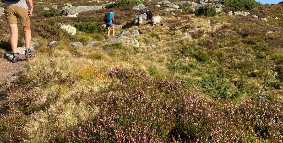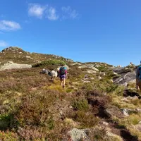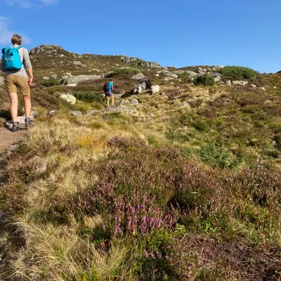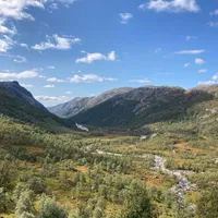 The first part of the hike to Blåfjellenden Tourist Cabin goes uphill until you reach the top of the mountain. Then you'll head over the mountain, past small waterfalls, streams and wetlands – and lots of berry bushes and other mountain plants that give the landscape its unique character. Remember to look up as you make your way over the mountain – and enjoy the views of cliffs and lakes as the landscape spreads out around you under the blue sky.